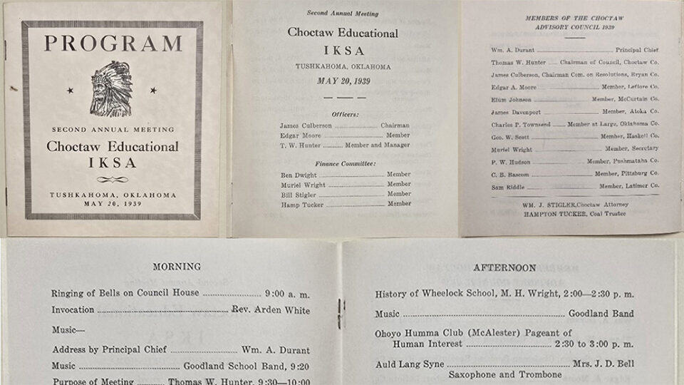 Officers of the Iksa Organization in 1939 included James Culberson (chairman), Edgar Moore (member), and Thomas Hunter (member and manager). All were former members of the pre-statehood Choctaw government. The 1939 meeting was held on May 20th and also featured speeches on Choctaw history, music, and plays performed by students from Goodland and Wheelock Academies. Choctaw Advisory Council member Muriel H. Wright organized and introduced an Ishtaboli (stickball) exhibition played by fourteen players from Jones Academy to the annual meeting. It was recognized as their second season of the game.